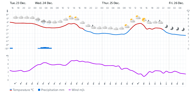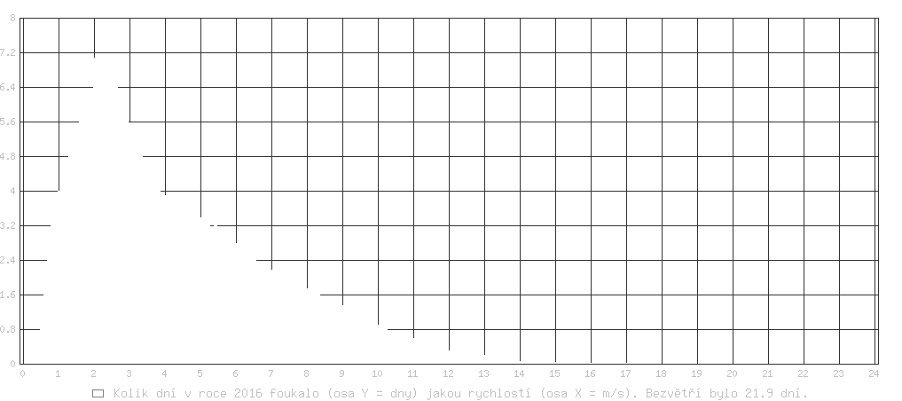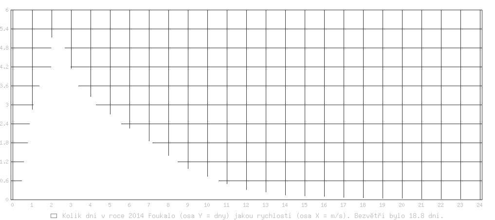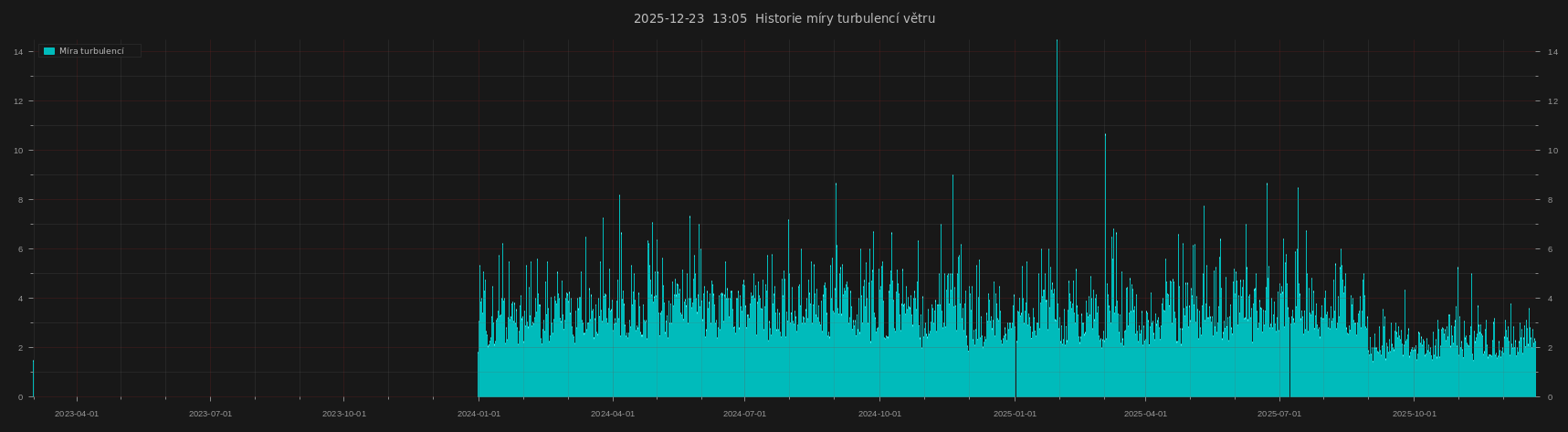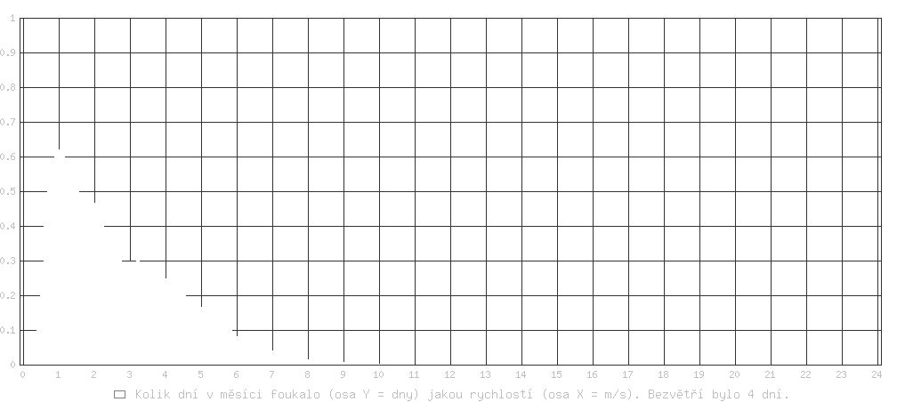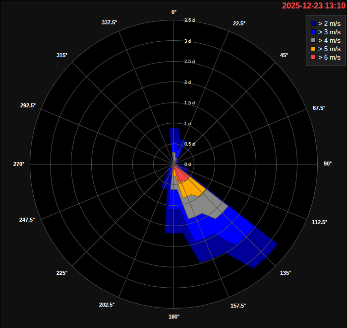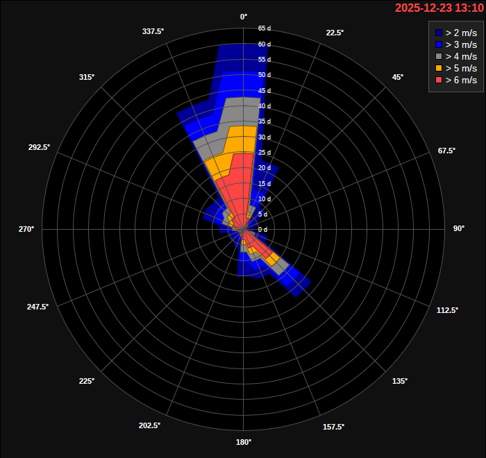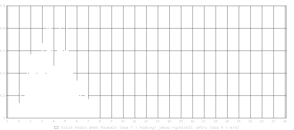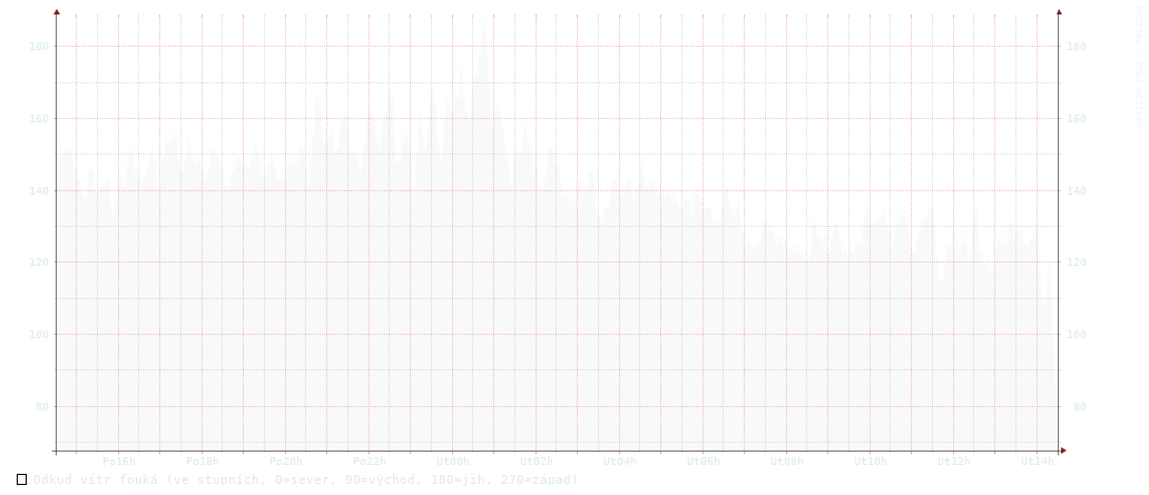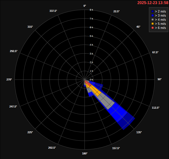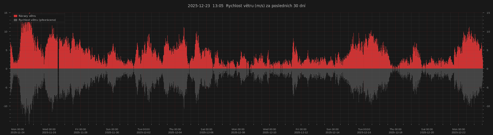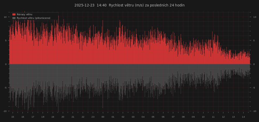 Průměrná rychlost větru za poslední minutu byla 1.3 m/s V posledních 24 hodinách nárazy větru kolísaly mezi 1 m/s a 11.2 m/s
